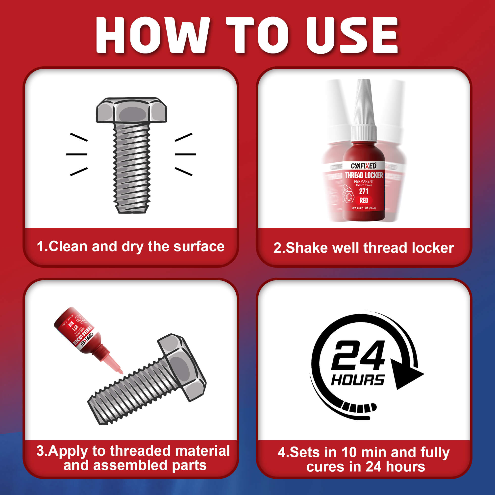 PERMANENT FIXING: CYAFIXED Red Threadlocker cures in 10 minutes and is complete hardening within 24 hours. It seals permanently, prevents tampering, and can only be removed after the part has been heated to 500°F (260°C) to cure.